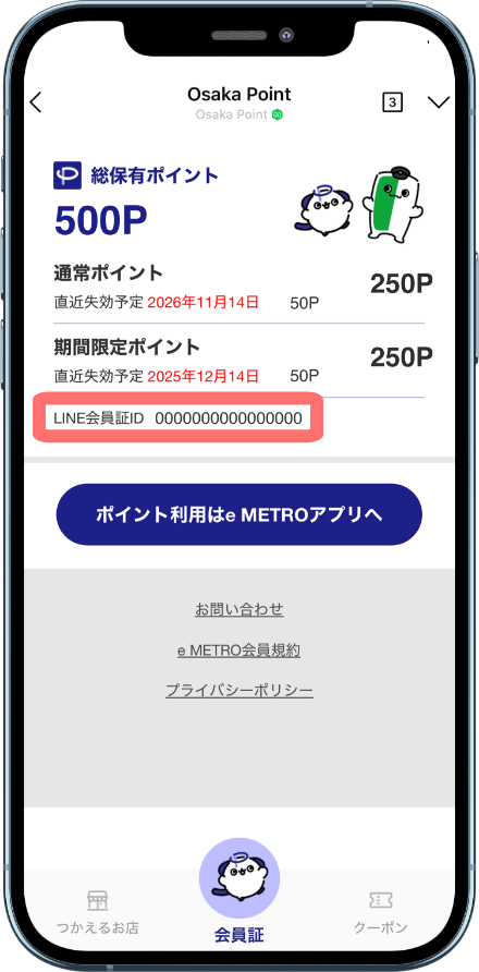 LINE会員証より「LINE会員証ID」を確認し、e METROアプリに登録してください。