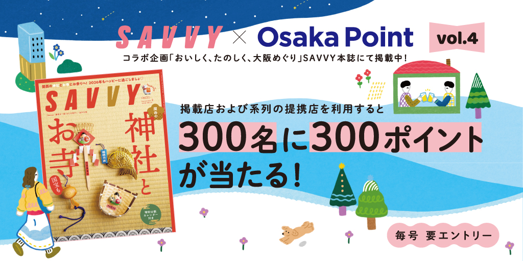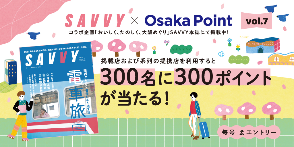 月刊誌「SAVVY」とのコラボ企画「おいしく、たのしく、大阪めぐり」がはじまりました!Osaka Pointがたまる・つかえるお店をSAVVY本誌にて毎月掲載中。本誌と連動して、SAVVY読者限定のお得なキャンペーンも実施します!