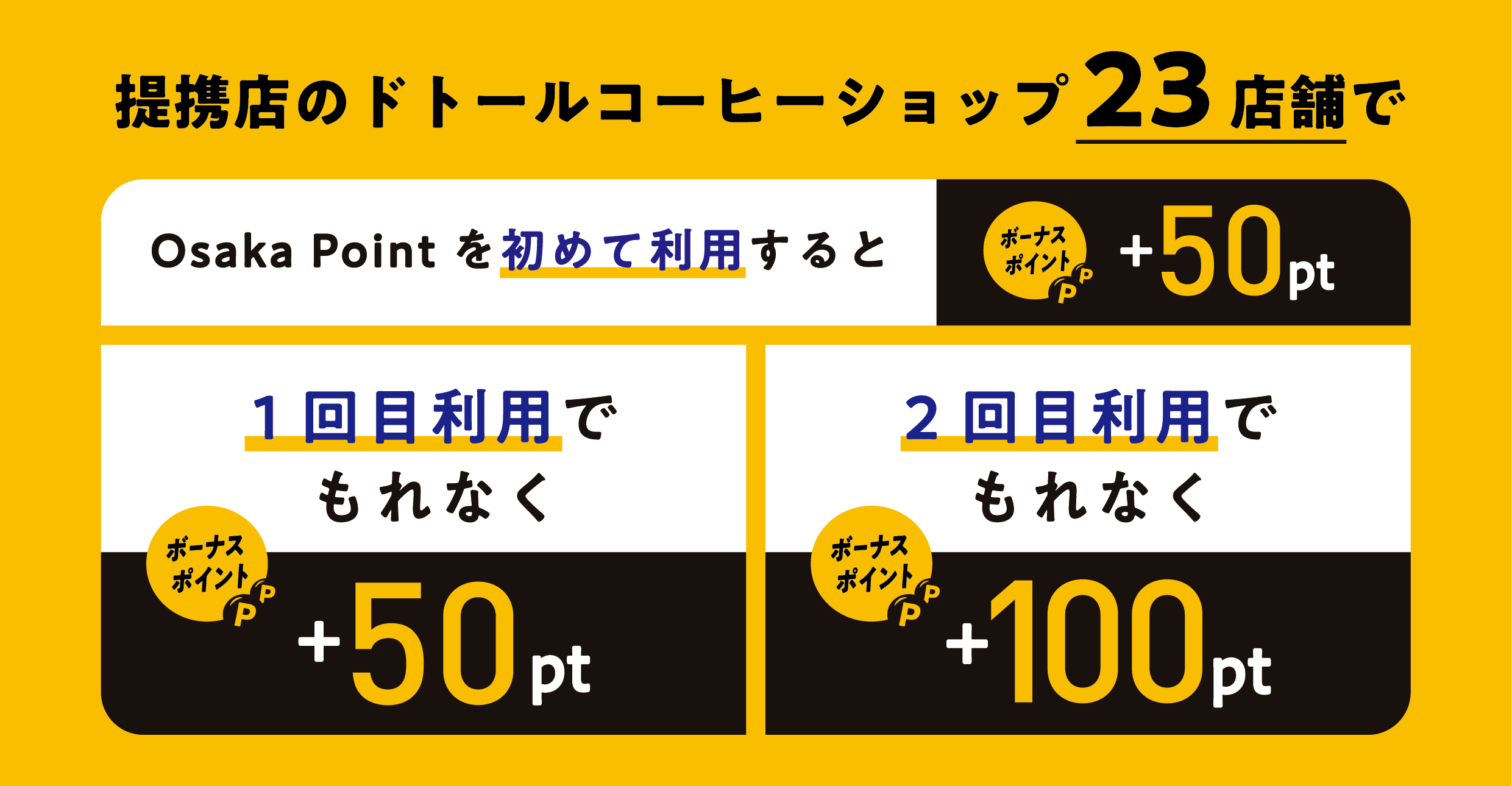 ・期間中、提携店のドトールコーヒーショップ(23店舗)のお会計時にe METROアプリまたは、Osaka Pointカードを提示すると、支払金額の1%相当(即時進呈)に加え、後日ボーナスポイントを進呈します。