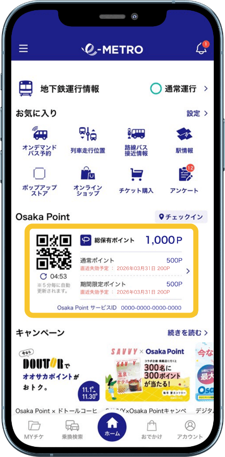 - ・e METROアプリにOsaka Pointカードを連携されている会員様は、連携されているカード情報を削除する必要があります。(削除したOsaka Pointカードはご利用いただけませんので、ご注意ください。)