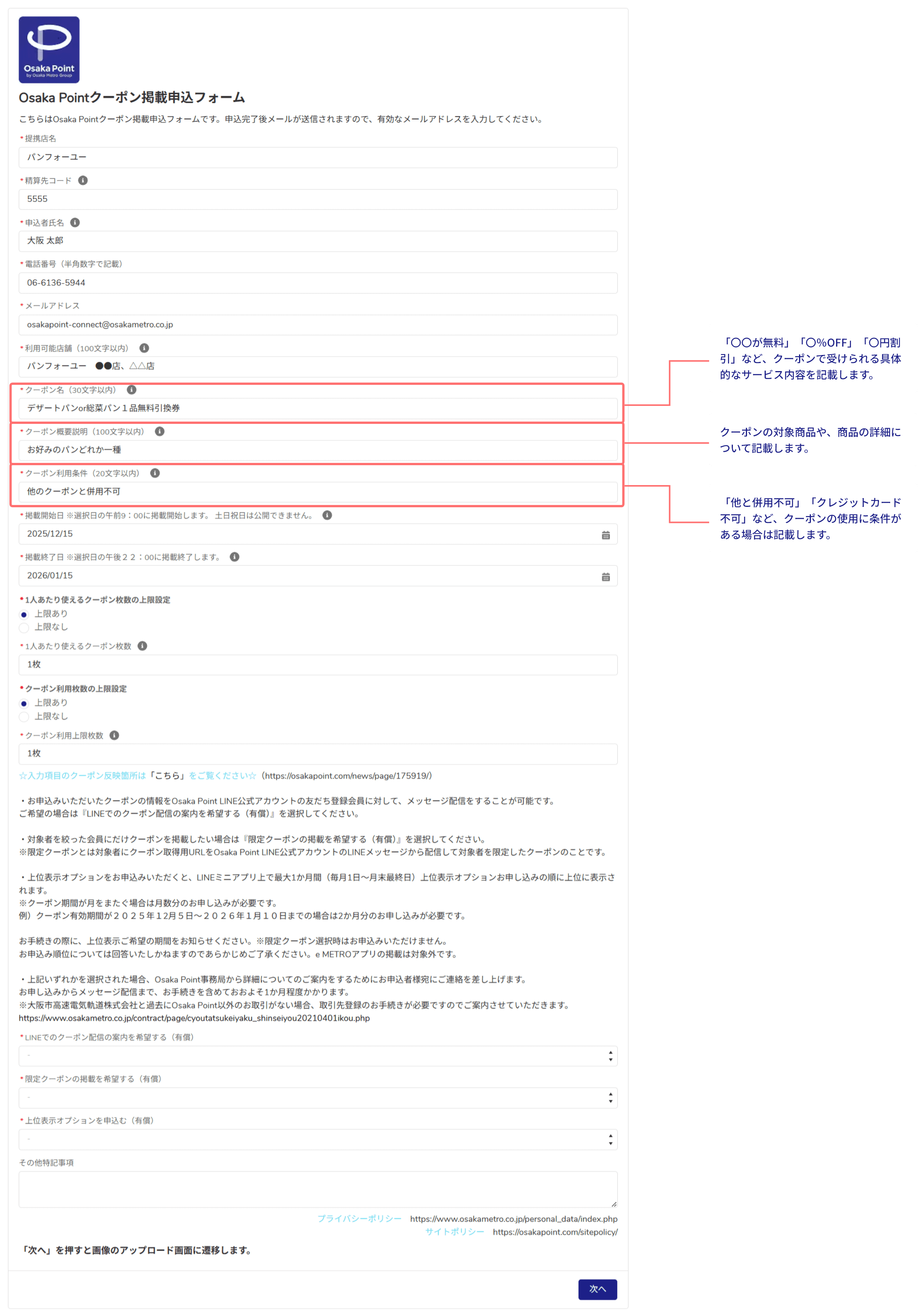Osaka Pointクーポン 掲載申込フォーム(記入例)