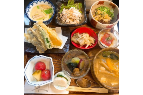 ランチタイムには、品数豊富なひらた御前が人気。揚げたてでサクサクの天ぷらをはじめ、出汁の効いた味噌汁や季節を感じる小鉢まで揃い、満足感の高い内容です。どのおかずも主役級の美味しさで、最後まで飽きることなく楽しめます。