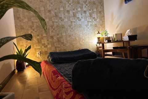 程よい明るさの照明で、柔らかく落ち着いた雰囲気の施術スペースです。少しアジアンテイストな雰囲気も味わいながら施術をお楽しみください。気を使わず気楽に来れるサロンを目指して、男性・女性問わずお越しいただけます。お電話でのご予約も可能なので、ぜひお気軽にお越しください♪