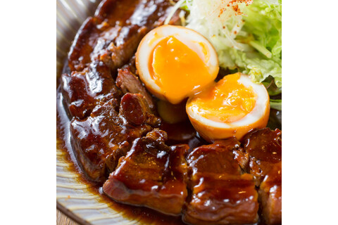 当店名物・トロトロになるまで煮詰めた豚の角煮!口の中に入れると、ほろほろとほどけて、角煮の旨味が広がります。とろける食感にやみつき間違いなし!サイズは2種類。女性や1名様に嬉しいハーフサイズ(880円)とガッツリ食べられるフルサイズ(1,380円)をご用意しております。まずはそのまま食べて、その次は当店だけの魔法の食べ方で…♪どんな食べ方かは秘密!ぜひご来店して秘密を明かしてください。