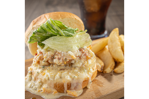 ジューシーサクサク揚げたチキンカツに自家製タルタルソースをかけて特製バーガー♪たっぷりとかかったタルタルソースがチキンカツとの相性抜群が抜群!見た目から伝わる美味しさを裏切らないバーガーです。