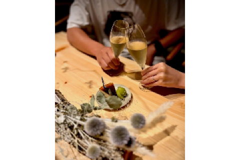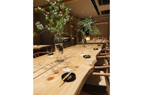 檜・杉・欅の無垢材に包まれた温かな空間で、JBL4344から流れるジャズが食事をやさしく演出。和でも洋でもない、その“あわい”に身を委ねながら、会話と料理が自然にほどけていく時間をお届けします。接待やデート、集まりにも心地よいレイアウトで、半個室やプロジェクターも完備。空間そのものを味わう贅沢をぜひ。
